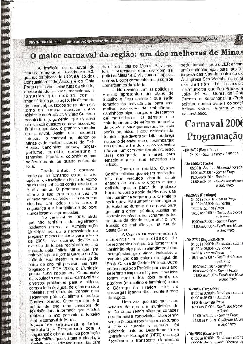 Em, 1926, existia em Prados um carnaval de rua que desfilava pela cidade, partindo de frente da casa do Dr. Patrício (casa do Ademar Campos) até o Patamar (em frente a casa do Mamede). Em frente a Rua Marejor Reginaldo Silva, havia uma praça onde a banda fazia as retretas relativas ao carnaval, em frente a casa do antigo prefeito Paulo Vale.