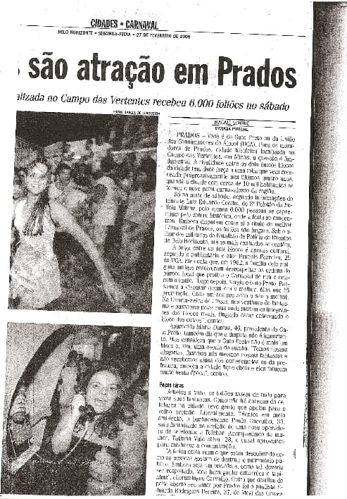 Vieram desfilar em Prados a pedido do pessoal do Gato Preto. Contavam ainda com cavaleiros enfeitados que ficavam em fila. A rainha veio em uma charrete da Prefeitura Municipal, guiada por Nelson Teixeira (in memória).